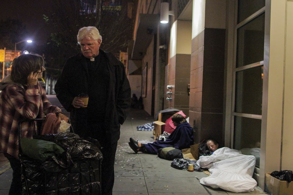 I think of a parishioner who shared his all-too common story with me recently, I’ll call him Oscar. We met around 3am in San Francisco’s Mission District, a vibrant, beautiful, historically Hispanic part of the city. I passed Oscar on my walk down the street. He was going through garbage looking for recyclable cans for cash refunds. We exchanged eye-contact, a “Hi, How’s your night going,” and ended up chatting. The clerical collar tends to make it easy for people to feel safe to open up. Oscar shared with me how his evening had been going (it had gone well, he had a whole garbage bag of cans), and about where he was going to sleep that night (a cardboard box in the entrance of an “American Apparel” store).